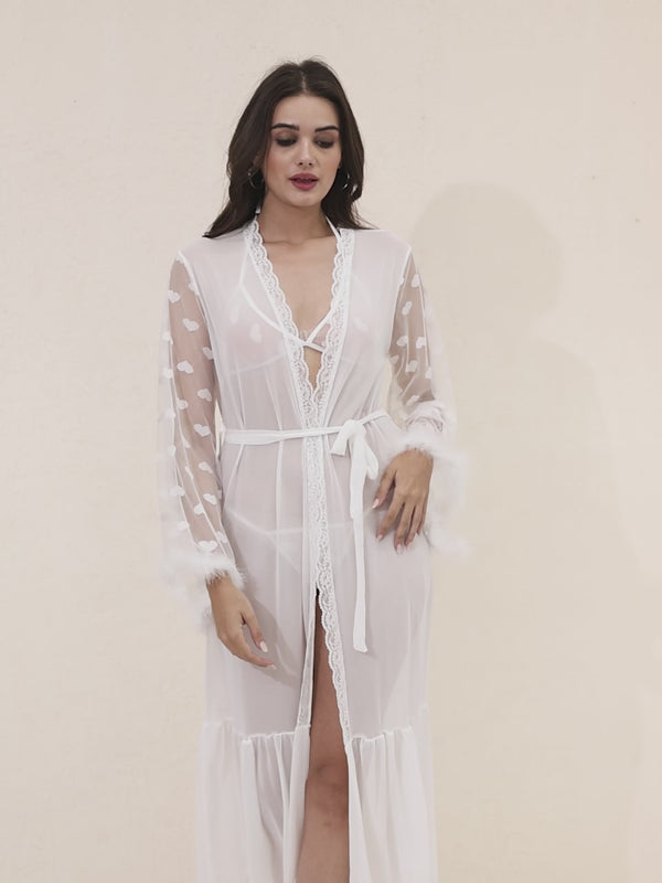 Turn up the charm with this elegant 3-piece white lingerie set for women, featuring a sheer lace robe with heart patterns, a delicate halter bralette, and a matching thong. Perfect for honeymoon nights, bridal lingerie, or romantic evenings, this seductive nightwear set is designed with soft, breathable fabric and luxurious feather-trimmed sleeves. The robe includes a waist tie for an adjustable fit and graceful silhouette.
